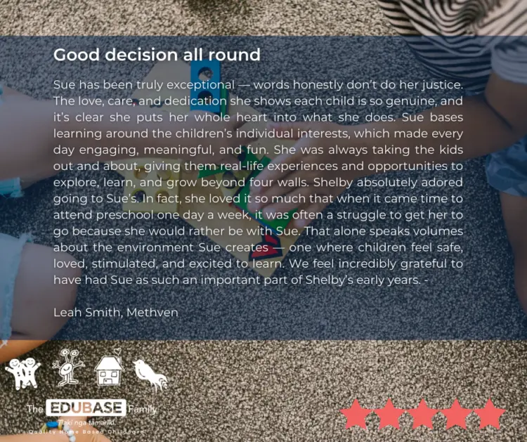 Sue has been truly exceptional — words honestly don’t do her justice. The love, care, and dedication she shows each child is so genuine, and it’s clear she puts her whole heart into what she does. Sue bases learning around the children’s individual interests, which made every day engaging, meaningful, and fun. She was always taking the kids out and about, giving them real-life experiences and opportunities to explore, learn, and grow beyond four walls. Shelby absolutely adored going to Sue’s. In fact, she loved it so much that when it came time to attend preschool one day a week, it was often a struggle to get her to go because she would rather be with Sue. That alone speaks volumes about the environment Sue creates — one where children feel safe, loved, stimulated, and excited to learn. We feel incredibly grateful to have had Sue as such an important part of Shelby’s early years.